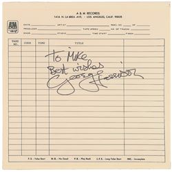 Large felt tip signature and inscription, “To Mike, Best wishes, George Harrison,” on an off-white 9.5 x 9.5 A&M Records studio log sheet. In fi...