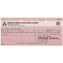 National Westminster Bank Limited check, 7.75 x 3.5, filled out in another hand and signed by Harrison, payable to Harrisongs Limited for £9,67...