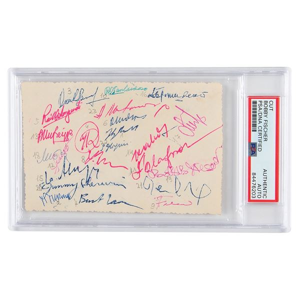 Vintage red ballpoint signature, "Bobby Fischer," on the reverse of a 5 x 3.25 postcard depicting the 21 competitors of the 1958 Portoroz ...