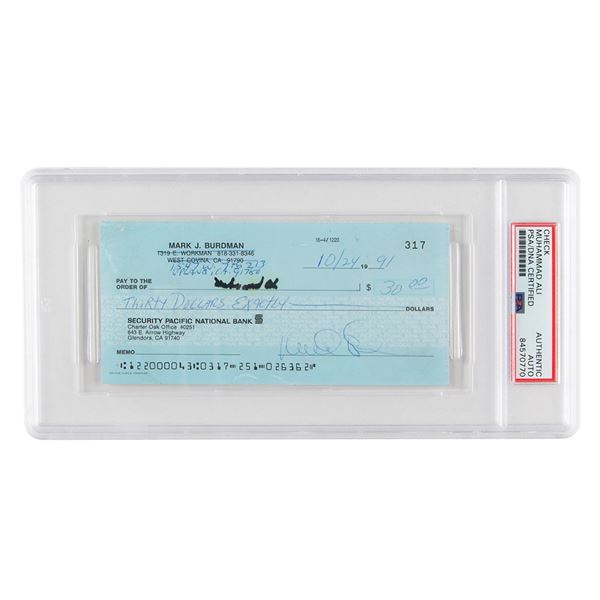 Personal check belonging to Mark J. Burdman, 6 x 2.75, October 24, 1991, paying $30 to Muhammad Ali, who signs his name in black felt tip in the payee