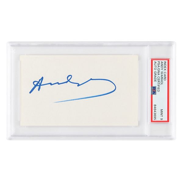Felt tip signature of Andy Warhol on an off-white 5 x 3 card. In very fine condition. Encapsulated in a PSA/DNA authentication holder, grading the aut