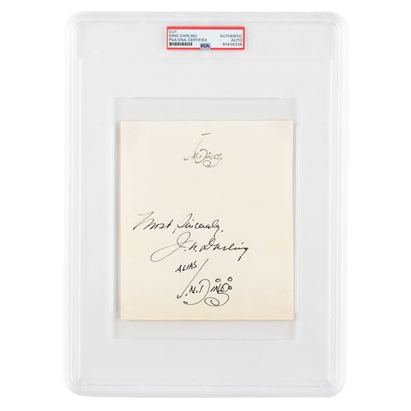 Desirable triple fountain pen signature, "J. N. Ding, Most sincerely, J. N. Darling, alias J. N. Ding,” on an off-white 6 x
