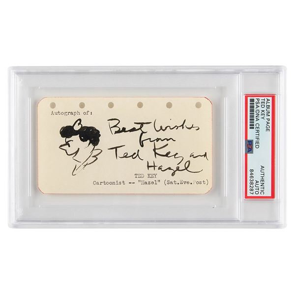 Original vintage ink sketch of Hazel accomplished by Key on an off-white 4.5 x 2.5 page, nicely signed in ink, "Best Wishes from Ted Key and Ha...