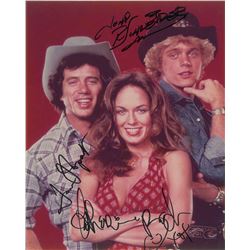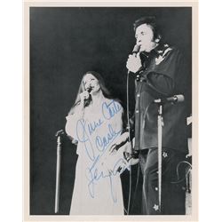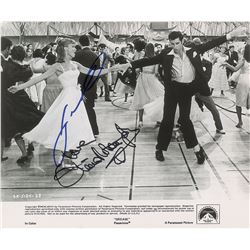 Glossy 9.75 x 8 mini lobby card for the 1978 film Grease, signed in blue felt tip, "John Travolta," and in black felt tip, "Love, Oli...