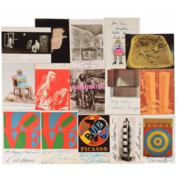 Collection of 15 postcards featuring various artworks, 5.75 x 4 to 4.75 x 6.5, each signed in ink or felt tip by the associated artist, with some insc