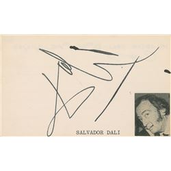 Vintage ink signature, "Dali,” on an off-white 5 x 3 card bearing a clipped image of the artist. Reverse bears a collector's ink notation i...