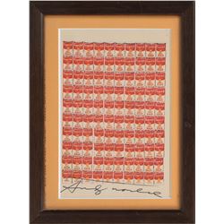 Iconic color 4 x 6 postcard of Warhol's classic 1962 work '100 Cans,' depicting a hundred Campbell's Soup cans, signed in the lower ...