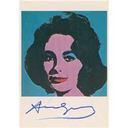 Color 4 x 6 postcard showing Andy Warhol's 1963 painting of Elizabeth Taylor, signed in the lower border in blue felt tip by the artist. In fine...