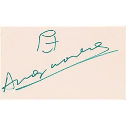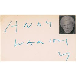 Vintage blue ink signature, "Andy Warhol,” on an off-white 5 x 3 card bearing an affixed image of the artist. In fine condition, with mild toni...