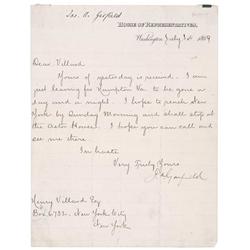 LS signed “J. A. Garfield,” one page, lightly-lined, 7.5 x 9.5, House of Representatives letterhead, July 1, 1869. Letter to well-known fi