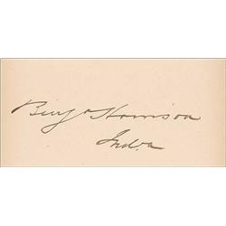 Ink signature, “Benj. Harrison, Inda,” on an off-white 4.75 x 2.25 trimmed album page. In fine condition, with a mild shade of overall ton