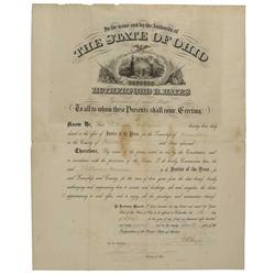 Partly-printed DS, signed “R. B. Hayes,” one page, 13.75 x 17, April 11, 1867. Hayes, as governor of Ohio, appoints Patterson Harrison a J