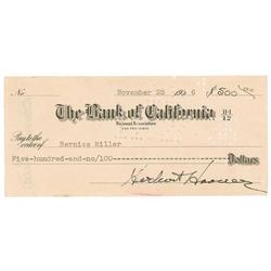 Exceedingly rare bank check, 6 x 2.75, filled out in type and signed by Hoover, payable to Bernice Miller for $500.00, November 25, 1936. Miss Bernice