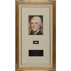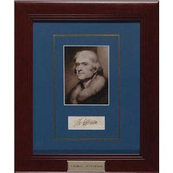 Bold and crisp ink signature, “Th: Jefferson,” on an off-white slip. Matted and framed with a portrait of Jefferson, to an overall size of