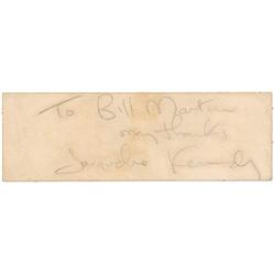 Pencil signature and inscription, “To Bill Martin, my thanks, Jacqueline Kennedy,” on an off-white 5 x 1.75 card. Reverse bears a Charles