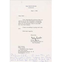 Handwritten postscript at the bottom of a May 1, 1962, TLS to Neil Letson, signed by John F. Kennedy’s secretary Evelyn Lincoln on White House l