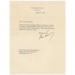 TLS as president, one page, 6.75 x 9, White House letterhead, April 5, 1961. Letter to Congressman Frank Stubblefield. In full: “I wish to take