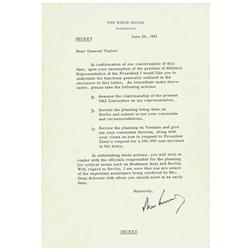 TLS as president, one page, 7.25 x 10.5, White House letterhead, June 26, 1961. Letter to General Maxwell Taylor, labeled “Secret” at the