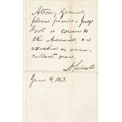 War-dated handwritten endorsement, as president, “A. Lincoln,” dated December 7, 1864, on an off-white 7 x 8 sheet, originally the integra