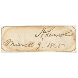 Ink signature, as president, “A. Lincoln, March 9, 1865,” on an off-white 2.25 x .75 slip affixed to a slightly larger card. In very good