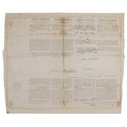 Partly-printed DS as president, one page, 20.5 x 16.5, November 4, 1809. Four language ship’s papers issued to “Benjamin C. Simmons, maste