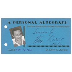 Heavyweight boxing champion of the world, 1934-1935. Vintage fountain pen signature, “Sincerely, Max Baer, 9/10/35,” on a 5.5 x 2.75 blue