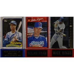 Three color baseball trading cards, various years and makers, each signed on the front in blue felt tip by the respective player pictured: Nolan Ryan,