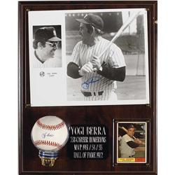 Glossy 10 x 8 photo of Berra in his Yankees uniform, signed in blue felt tip; an official Rawlings American League baseball, signed on the sweet spot