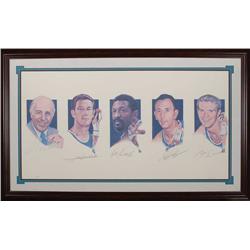 Color limited edition 35.5 x 18.5 lithograph entitled Legacy I, numbered #451/500, signed in pencil by Red Auerbach, John Havlicek, Bill Russell, Bob