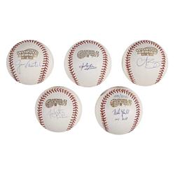Five official Rawlings World Series baseballs, each signed in ballpoint on the sweet spot or side panel by a member of the World Champion Boston Red S