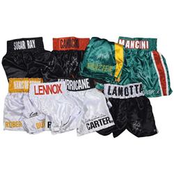 Eight pairs of boxing trunks, each signed in felt tip by a different boxing great. Signers are: Sugar Ray Leonard, Joe Frazier, Ray ‘Boom Boom...