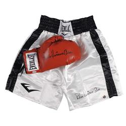 Two items: Everlast right-handed 10-ounce boxing glove, signed on the top in black felt tip; and a pair of white Everlast boxing trunks, also signed i