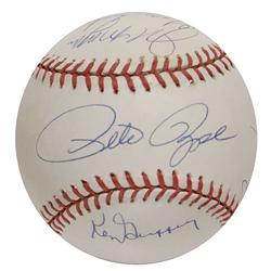 Official Rawlings National League baseball signed in blue ballpoint by all eight members of the starting line-up of the Big Red Machine: Pete Rose (ss