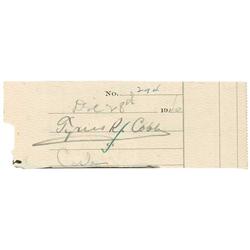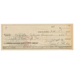 Bank check, 8.5 x 3, filled out in another hand and signed by Cobb, “Tyrus R. Cobb, Pres,” and adding “United Apt. Co.,” above