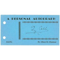 Vintage fountain pen signature, “Ty Cobb,” on a 5.5 x 2.75 blue card from the Albert R. Chestnut collection. Light paperclip impression to
