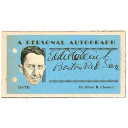 Vintage fountain pen signature, “Eddie Collins, Boston Red Sox,” on a 5.5 x 2.75 blue card from the Albert R. Chestnut collection. Attache