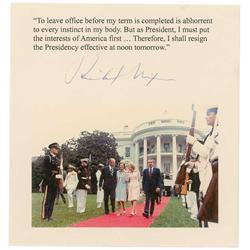 Ink signature, “Richard Nixon,” on an off-white 6 x 6 sheet, to which was later added a quote from President Nixon’s resignation add