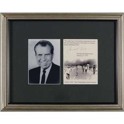 Blue ink signature, “Richard Nixon,” on an off-white 5.5 x 5.5 sheet, to which was later added a quote from President Nixon’s Januar