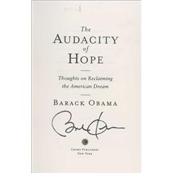 Signed book: The Audacity of Hope. First edition, later printing. NY: Crown Publishers, 2006. Hardcover with dustjacket, 6.5 x 9.5, 375 pages. Signed