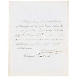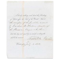 Partly-printed DS, signed as president, one page, 7.25 x 7.25, July 1, 1853. President Pierce orders the Secretary of State “to affix the Seal o