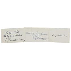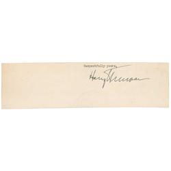 Ink signature, “Harry S. Truman,” on an off-white 8 x 2.25 slip, clipped from the closing of a letter. In fine condition, with a bit of sc
