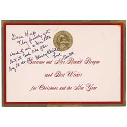 Pre-printed Christmas card sent as governor of California to his longtime friend Lydia “Hup” MacArthur, 6.25 x 4.5. Reagan pens a short no
