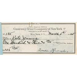 Bank check, 6.5 x 2.75, filled out in another hand and signed by Roosevelt, payable to Kate Jennings for $105.00, March 5, 1945. Cancellation holes, b
