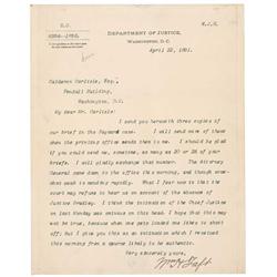 Early TLS signed “Wm. H. Taft,” one page, 8 x 10, Department of Justice letterhead, April 22, 1891. Letter to Calderon Carlisle. In part: