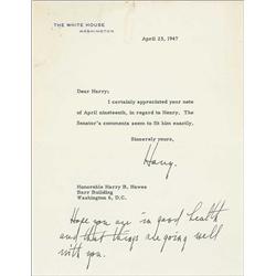 TLS as president signed “Harry,” one page, 7 x 9, White House letterhead, April 23, 1947. Letter to Harry B. Hawes responding to a note re