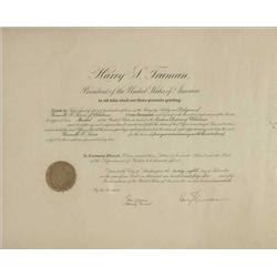 Partly-printed DS as president, one page, 20 x 16, September 28, 1945. President Truman appoints Granville T. Norris of Oklahoma “a Marshal of t