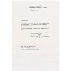 TLS, one page, 7.25 x 10.5, personal letterhead, June 5, 1967. Truman sends thanks for birthday wishes. In part: “Thank you very much for your k