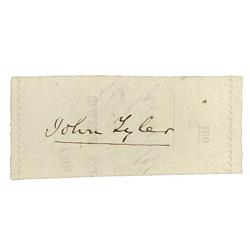 Ink signature, “John Tyler,” on an off-white 2.5 x 1 slip clipped from a check, with Tyler’s signature on reverse portion. Signature