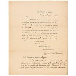 Partly-printed DS, signed “M. Van Buren,” one page, 8 x 10, May 4, 1829. Document sent to the Governor of Georgia transmitting a copy of t