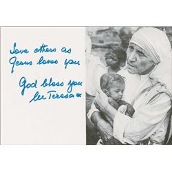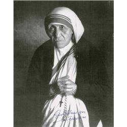 Matte-finish 8 x 10 photo of Mother Teresa clutching her rosary, signed in blue ink, “God bless you, M. Teresa mc.” In fine condition. Pre